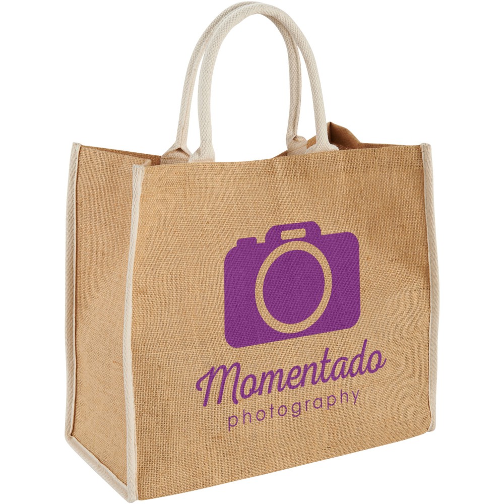The Large juta bevásárlótáska tépőzáras kialakítással. A lehajtható fülek magassága 17 cm. Megjegyzés: finom grafikát vagy szöveget nem, csak vastag, erős nyomatott lehet az anyagon alkalmazni. Juta. Emblémázás: Szitanyomás