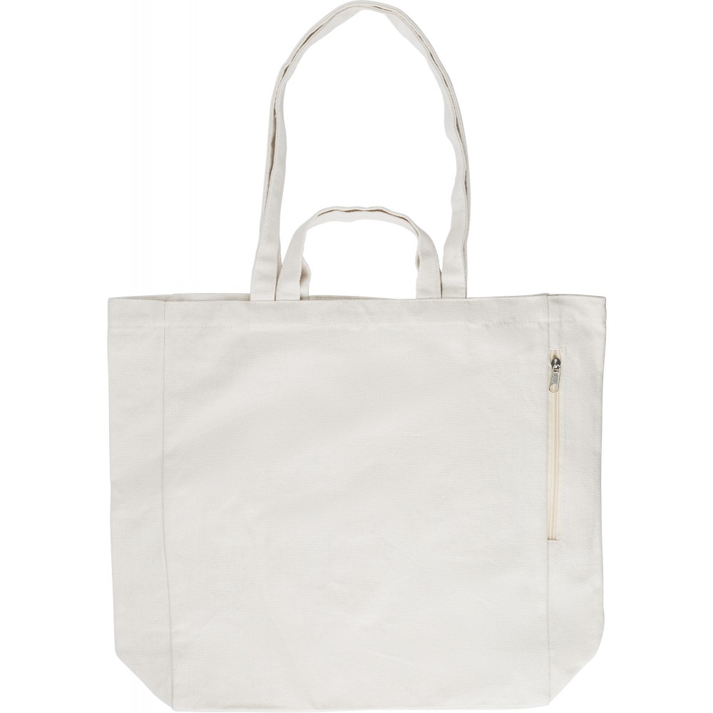 Újrahasznosított pamut bevásárlótáska rövid és hosszú füllel. Oldalt cipzáras zseb. 350g/m2 Emblémázás: Szitanyomás