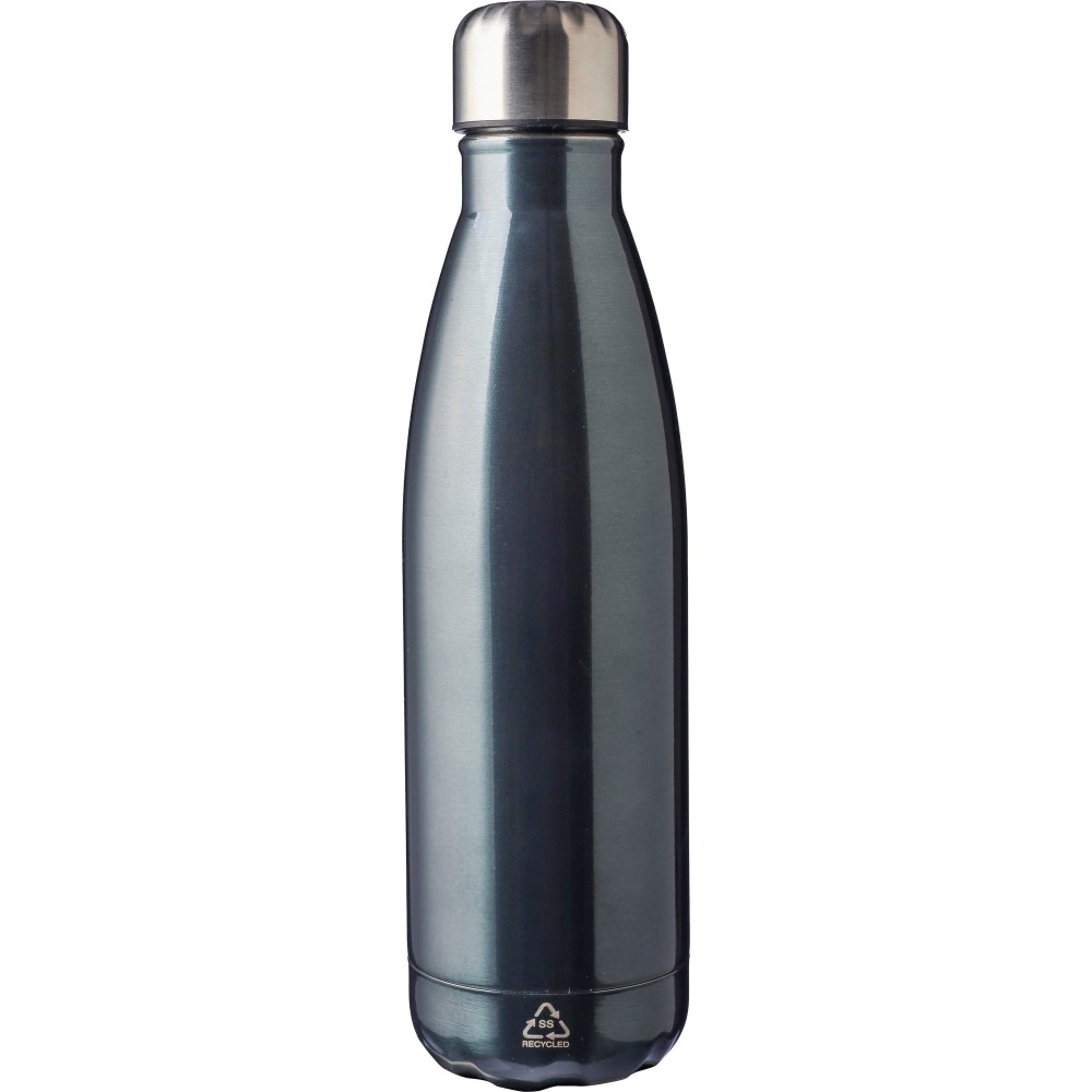 Újrahasznosított rozsdamentes acél, egyrétegű kulacs csavaros kupakkal. 304-es rozsdamentes acélból készült. Az újrahasznosított logó gravírozva van a kulacson. Egyenként barna kartondobozba csomagolva. Űrtartalom: 650 ml. Emblémázás: Bögredekor, Gravírozás, UV nyomtatás