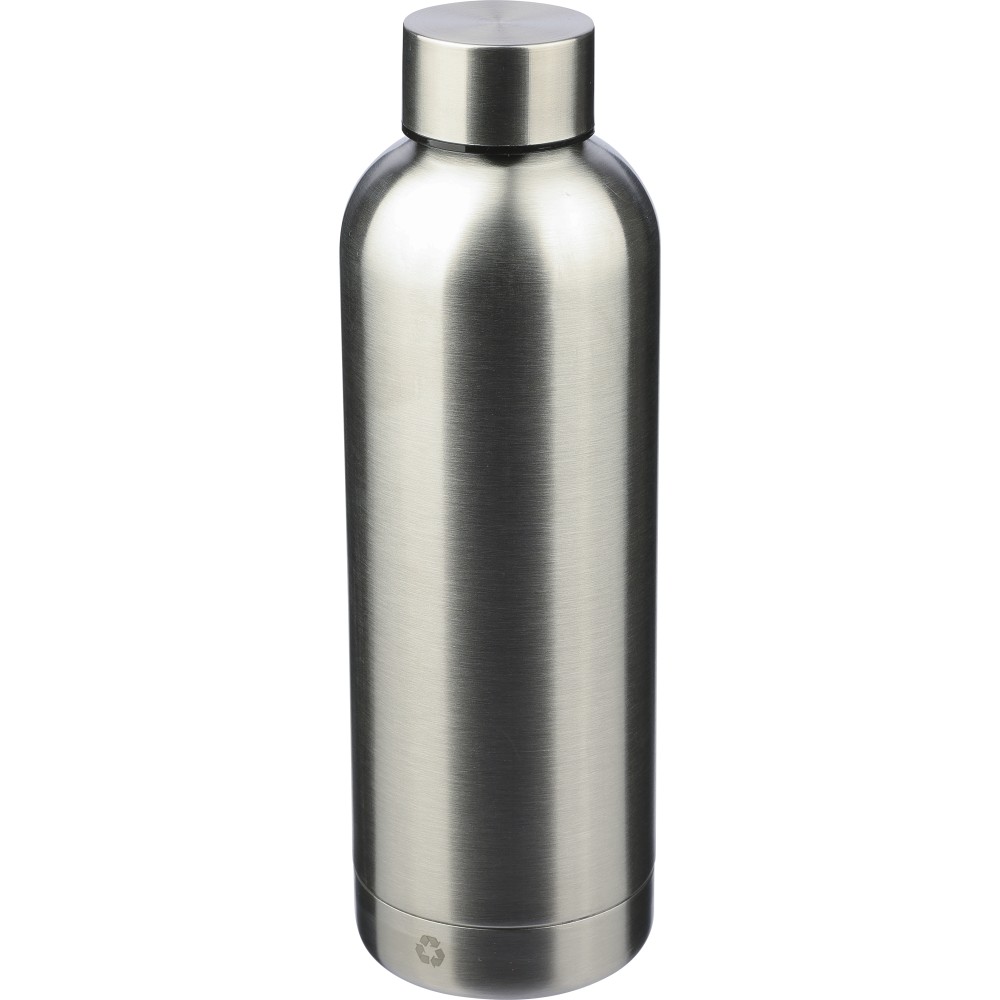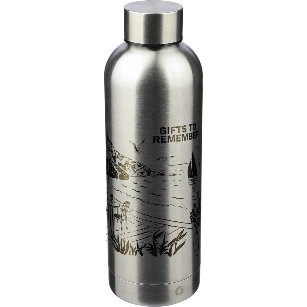 Újrahasznosított rozsdamentes acél (s/s304) duplafalú palack, matt felülettel. Barna kartondobozba egyedileg csomagolva. Űrtartalom: 500 ml. Emblémázás: Bögredekor, Gravírozás, Körszita, Tamponnyomás, UV nyomtatás