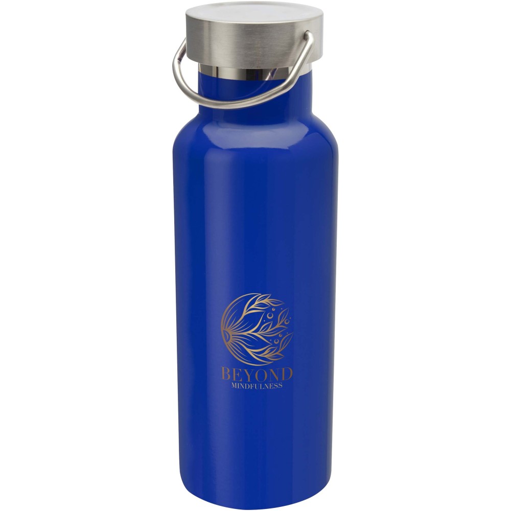 Tartós, dupla falú vákuum szigetelésű, RCS tanúsítvánnyal rendelkező rozsdamentes acél palack csavaros kupakkal és fogantyúval. Űrtartalma: 500 ml. Cseppálló. Ajándékdobozba csomagolva szállítjuk. Emblémázás: Bögredekor, Gravírozás, Körszita, Tamponnyomás