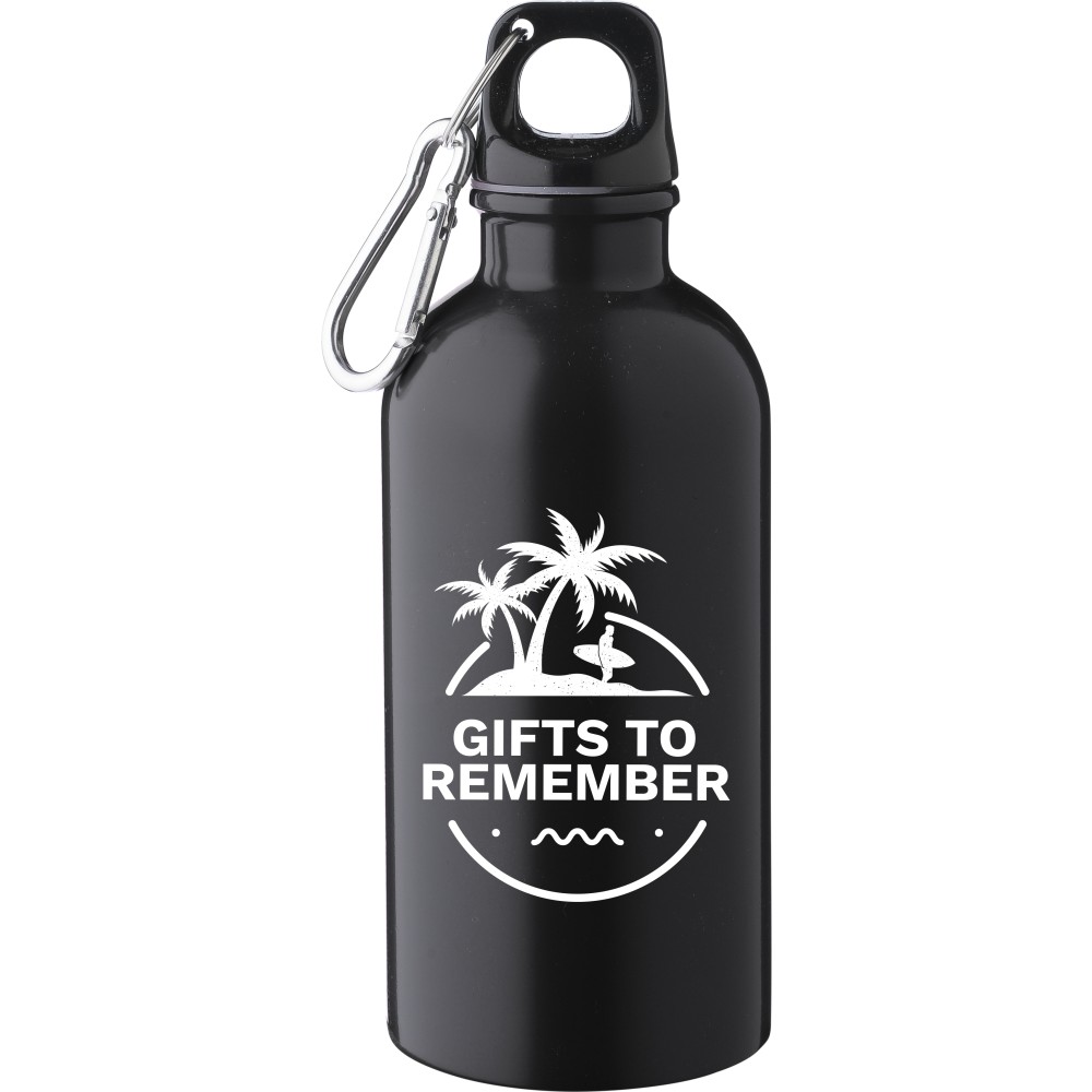 Újrahasznosított rozsdamentes acélból készült 400 ml-es szimplafalú kulacs PP kupakkal és alumínium karabinerrel. Az újrahasznosított anyagra utaló logó a palackra van gravírozva. Mosogatógépben nem tisztítható. Emblémázás: Bögredekor, Gravírozás
