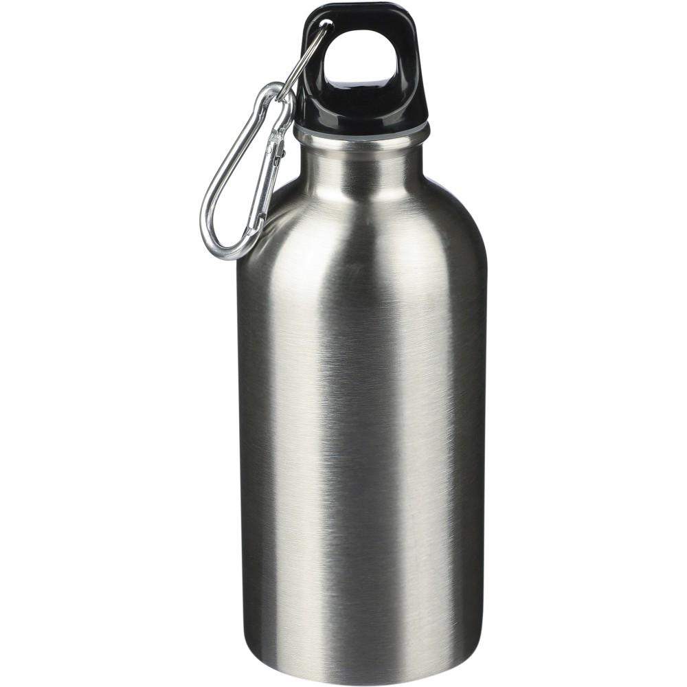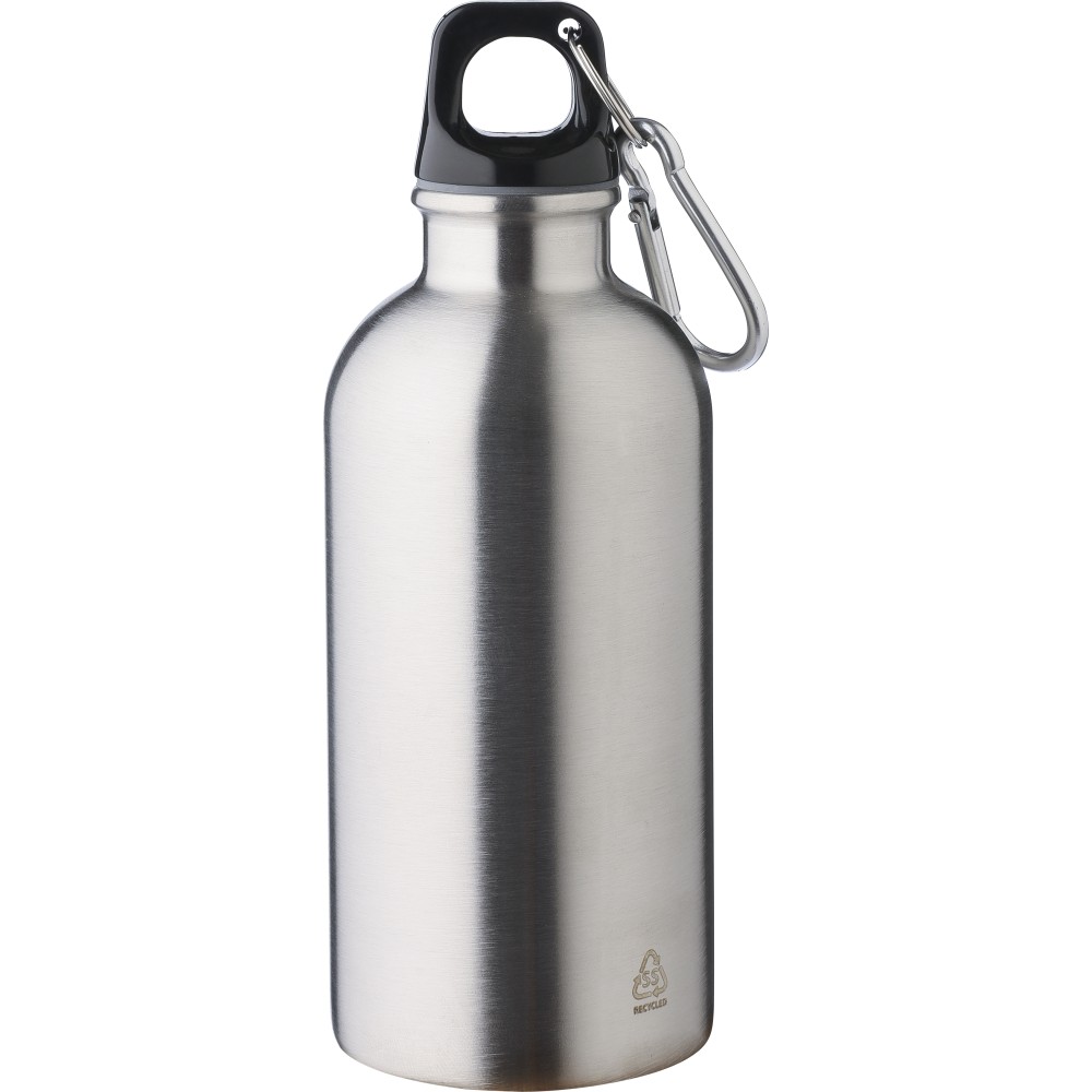 Újrahasznosított rozsdamentes acélból készült 400 ml-es szimplafalú kulacs PP kupakkal és alumínium karabinerrel. Az újrahasznosított anyagra utaló logó a palackra van gravírozva. Mosogatógépben nem tisztítható. Emblémázás: Bögredekor, Gravírozás