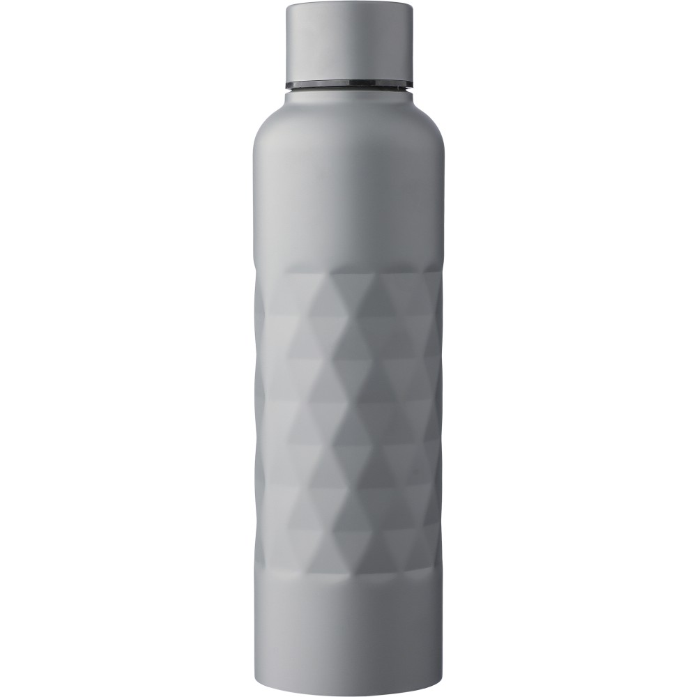 Újrahasznosított 304-es rozsdamentes acélból készült szimplafalú kulacs, 800 ml-es. Gyémánt alakú textúrával a testen, csavaros tetővel és lézergravírozott újrahasznosított logóval. Egyenként csomagolva, barna kartondobozban. Emblémázás: Bögredekor, Gravírozás, Körszita